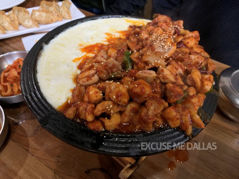 お友達が頼んでいたのはこちら。左側のチーズタッカルビもボリューミーでおいしそう。やけどしそうなぐらい熱そうでした。