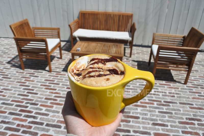 これだけビビッドな黄色をみていると、晴れやかな気分になりますよね!私たちが注文したものももちろん黄色のカップ。私はマシュマロドリンクを注文しました~一口飲んでからの写真撮影ですみません…