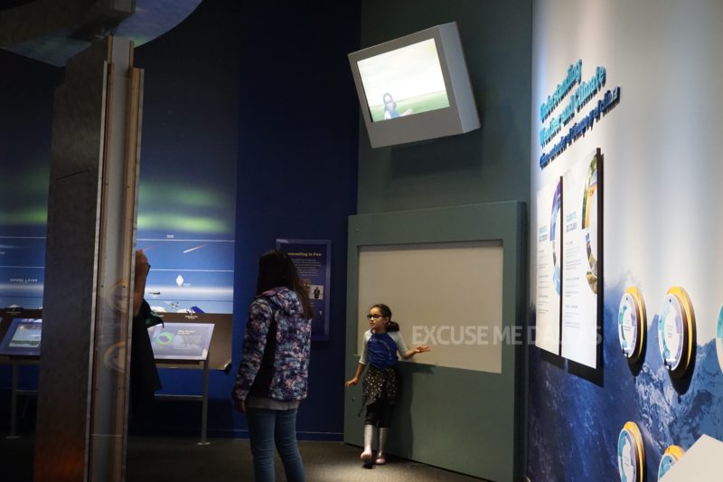 気象学のスペースではアナウンサーさながらに、お天気を伝えるブースや地べたに座って学芸員からの説明を聞き入る子供たちの姿も。 子供にとっては難しそうな話題も、興味を引くような楽しい体験が多く、もし私が子供だったら絶対に楽しいだろうな、と思います。