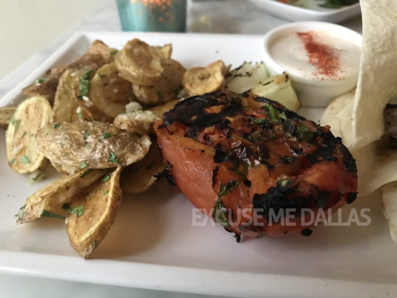 丸ごとトマトは焼かれて甘さが一層引き立ちます。ポテトはガーリック風味でなんだかごぼうチップスみたいな感じに変化。最初に食べたときに全くポテト感がないので夫が店員さんに「これ本当にポテト?」って聞いてみたのですがポテトだそうです。